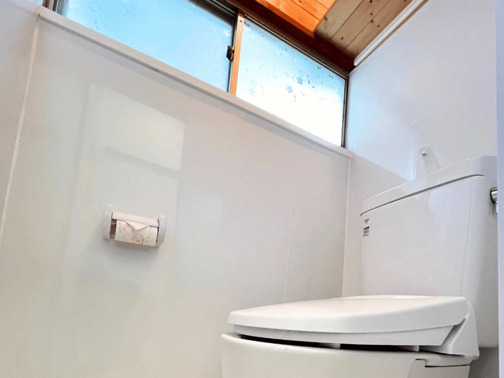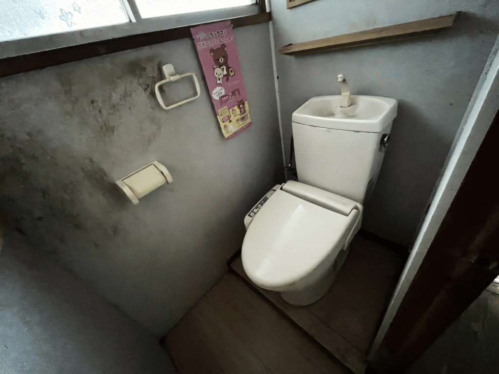 トイレは薄暗い雰囲気。そのまま掃除して使うか悩むところですが・・・