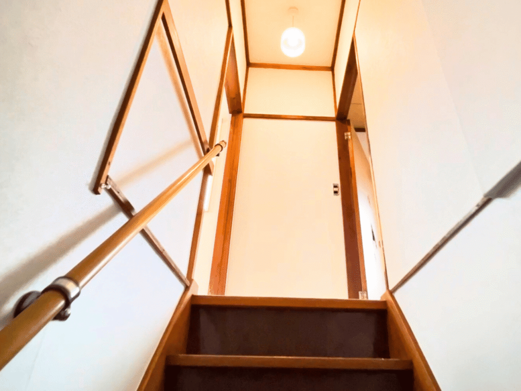 壁と天井に白いクロスを貼り、照明を新しくしただけでこれだけ明るい階段になりました。