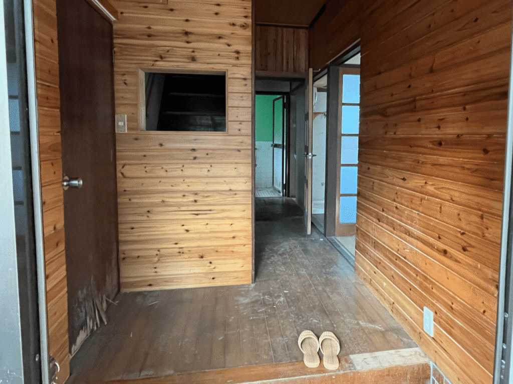 玄関を入ると板張りの壁。薄暗い雰囲気ですがオシャレな空間になるポテンシャルを感じました。
