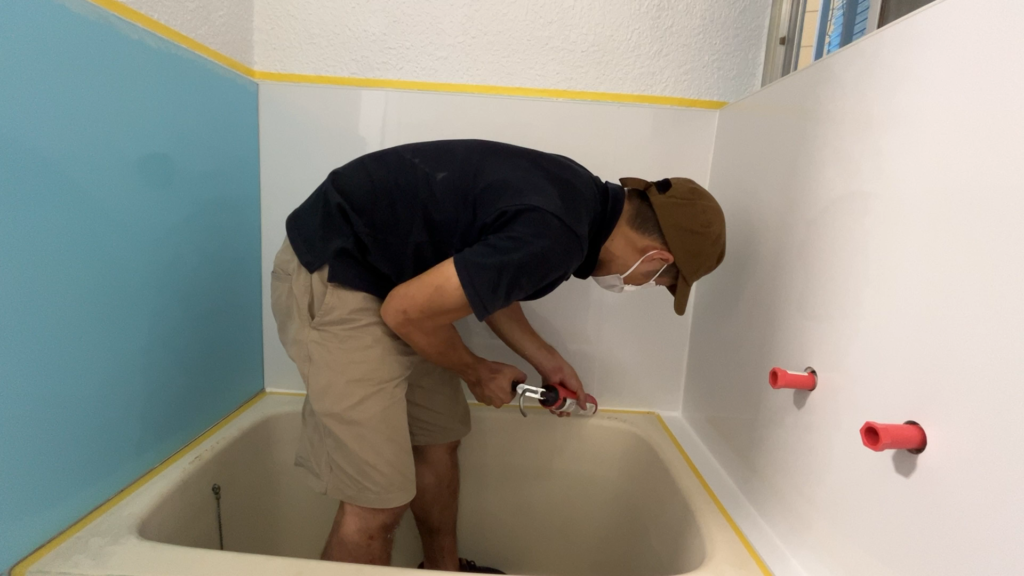 - 1号物件の浴室のNSシートと壁の取り合いにもコーキングを打った