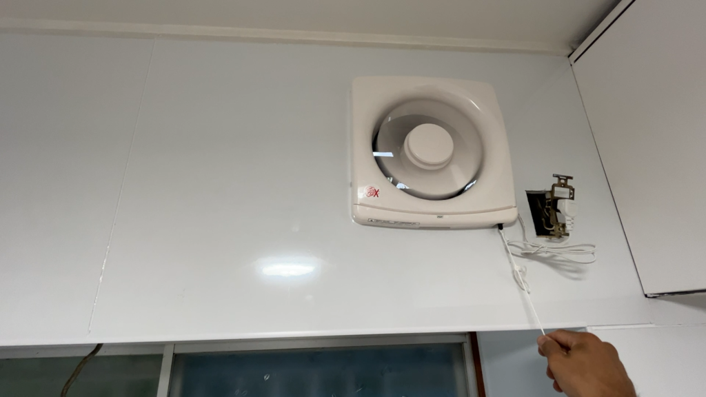 - 不要になった古い換気扇を取り外し、跡地にパネルを貼って塞ぐ処置を行った。