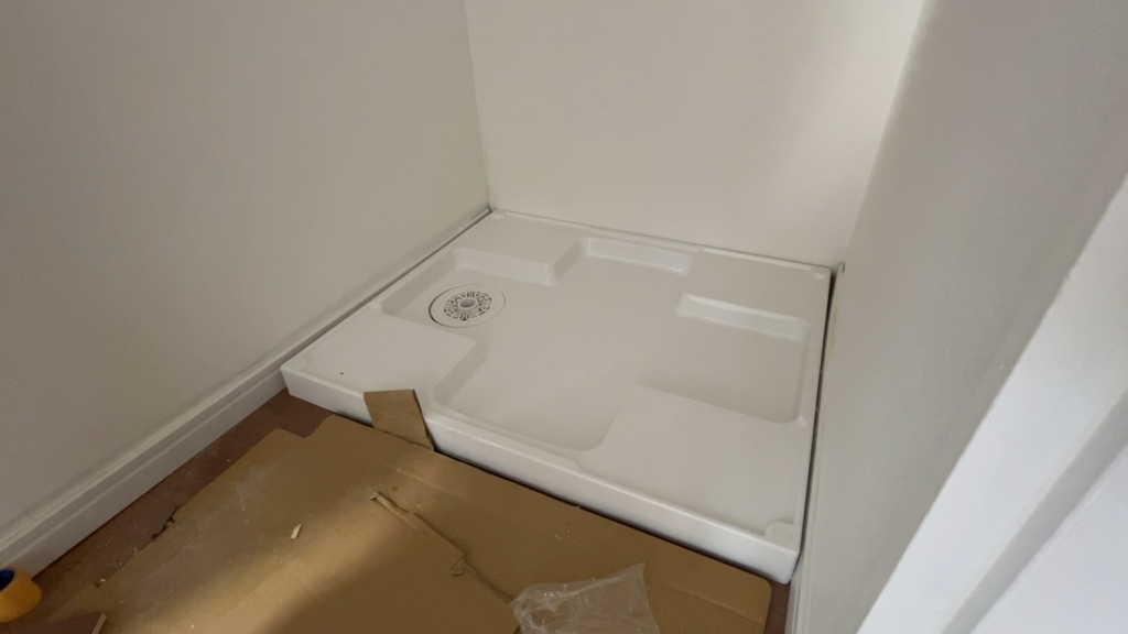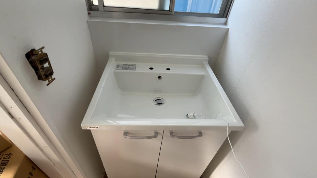 - 洗濯機パンの取り付けを実施。接着剤で固定し、スムーズに設置を完了させた。