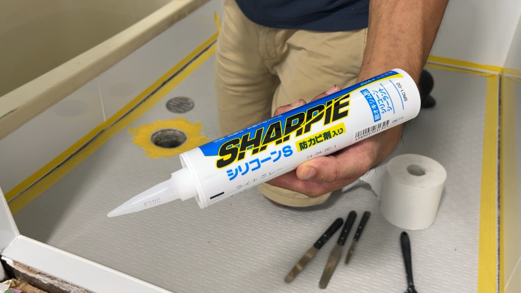 - 浴室のシートと壁の取り合いにグレーのシリコンコーキングを打った
