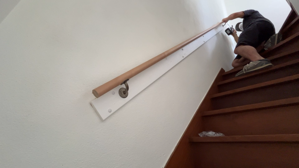 - 階段手すりを設置(2.7メートル、ブラケット4箇所固定)。エンドキャップ不足のため、そのまま仕上げた。